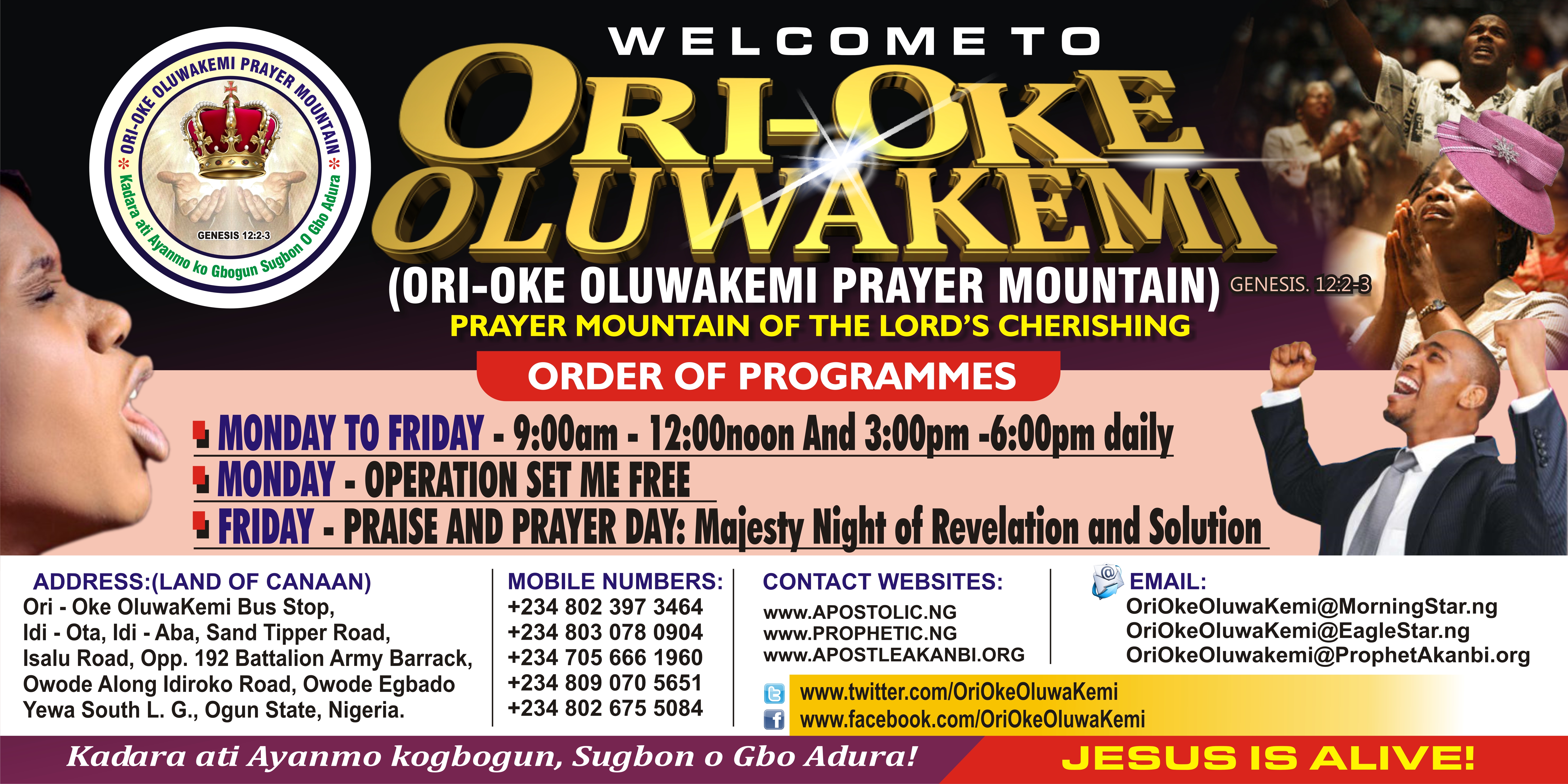 Ori-Oke OluwaKemi Bus-Stop, Isalu Road, (Sand Tipper Road), Idi-Ota, Idi-Aba, Off PowerLine, Opposite 192 Battalion Army Barrack, Owode Along Idiroko, Owode – Egbado, Yewa South L. G., Ogun State, Nigeria, P. O. BOX. 120, OTA, OGUN STATE, NIGERIA. AFRICA seer@prophetakanbi.org +234 802 397 3464, 234 075 666 1960
